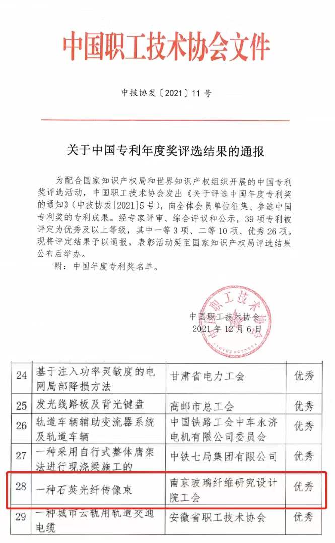 2021年12月6日,中國職工技術(shù)協(xié)會(huì )公布首屆中國專(zhuān)利年度獎評選結果,南京春輝科技實(shí)業(yè)有限公司參選的“一種石英光纖傳像束”專(zhuān)利榮獲中國專(zhuān)利年度獎——優(yōu)秀獎。在本次中國專(zhuān)利年度獎評選中,經(jīng)專(zhuān)家評審、綜合評議和公示,共有39項專(zhuān)利被評定為優(yōu)秀及以上等級,其中江蘇省范圍參選專(zhuān)利有9項獲獎。